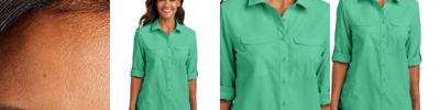 Sun and moisture are no problem for this versatile, lightweight, highly breathable shirt. Relaxed styling makes it perfect for outdoor or indoor wear. 2.2-ounce, 100% polyester poplin 2.5-ounce, 100% polyester poplin (White) Moisture-wicking UPF rating of 30 Straight collar Dyed-to-match buttons Two chest pockets with concealment flaps and hook and loop closures Roll sleeves with button tabs Vented back panel with mesh ventilation Rounded hem