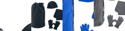 • Drawcord pouch packed with matching fleece hat, gloves and scarf