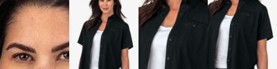 • Relaxed open neckline with twill placket and self-fabric collar