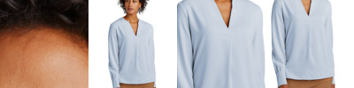 The soft satin fabric of this versatile blouse has a subtle sheen, lending an elegant look to any outfit. Designed for an easy fit to keep you feeling confident and comfortable. 4.1-ounce, 100% polyester satin Anti-static finish Open v-neck popover Wide box pleat at back yoke Gathers at shoulders and cuffs Three self-fabric-covered buttons at cuffs Side vents