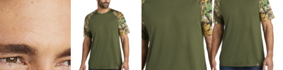 Step up your game in this moisture-wicking tee that delivers UV protection and features our unique drift camo print and bold colorblocking. 3.8-ounce, 100% polyester Color-locking PosiCharge technology (solid body only) UPF rating of 30 Tear-away removable label Raglan sleeves