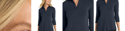 The updated look of this polo-inspired tunic has a longer length to keep you covered while still looking polished. The stretch in the machine-washable fabric ensures you feel comfortable. 6.6-ounce, 94/6 rayon/spandex jersey Self-collar with collar stand Buttonless front placket Notch detail on sleeve cuffs Side vents Slightly curved hem with drop tail